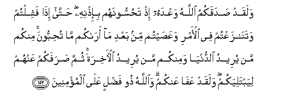 152. Walaqad sadaqakumu Allahu waAAdahu ith tahussoonahum bi-ithnihi hatta itha fashiltum watanazaAAtum fee al-amri waAAasaytum min baAAdi ma arakum ma tuhibboona minkum man yureedu alddunya waminkum man yureedu al-akhirata thumma sarafakum AAanhum liyabtaliyakum walaqad AAafa AAankum waAllahu thoo fadlin AAala almu/mineena