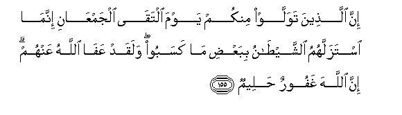 155. Inna allatheena tawallaw minkum yawma iltaqa aljamAAani innama istazallahumu alshshaytanu bibaAAdi ma kasaboo walaqad AAafa Allahu AAanhum inna Allaha ghafoorun haleemun