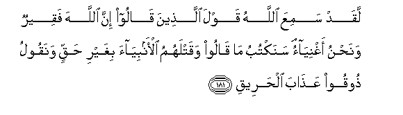 181. Laqad samiAAa Allahu qawla allatheena qaloo inna Allaha faqeerun wanahnu aghniyaon sanaktubu ma qaloo waqatlahumu al-anbiyaa bighayri haqqin wanaqoolu thooqoo AAathaba alhareeqi