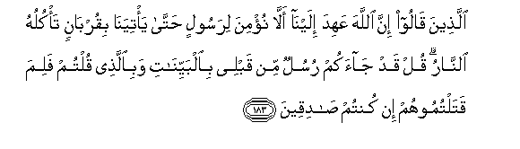 183. Allatheena qaloo inna Allaha AAahida ilayna alla nu/mina lirasoolin hatta ya/tiyana biqurbanin ta/kuluhu alnnaru qul qad jaakum rusulun min qablee bialbayyinati wabiallathee qultum falima qataltumoohum in kutum sadiqeena