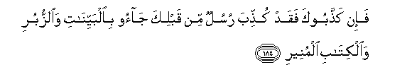 184. Fa-in kaththabooka faqad kuththiba rusulun min qablika jaoo bialbayyinati waalzzuburi waalkitabi almuneeri
