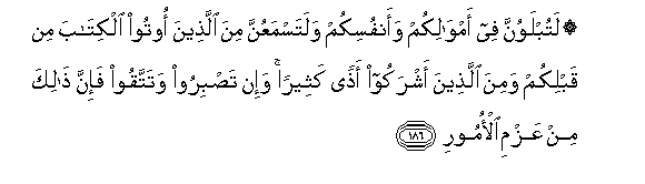 186. Latublawunna fee amwalikum waanfusikum walatasmaAAunna mina allatheena ootoo alkitaba min qablikum wamina allatheena ashrakoo athan katheeran wa-in tasbiroo watattaqoo fa-inna thalika min AAazmi al-omoori