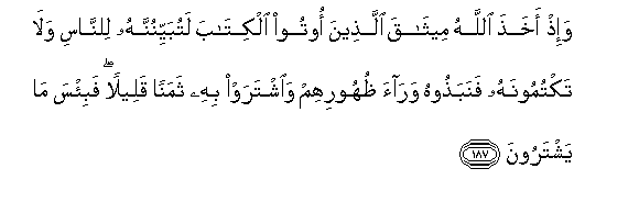 187. Wa-ith akhatha Allahu meethaqa allatheena ootoo alkitaba latubayyinunnahu lilnnasi wala taktumoonahu fanabathoohu waraa thuhoorihim waishtaraw bihi thamanan qaleelan fabi/sa ma yashtaroona