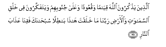 191. Allatheena yathkuroona Allaha qiyaman waquAAoodan waAAala junoobihim wayatafakkaroona fee khalqi alssamawati waal-ardi rabbana ma khalaqta hatha batilan subhanaka faqina AAathaba alnnari
