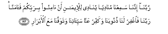 193. Rabbana innana samiAAna munadiyan yunadee lil-eemani an aminoo birabbikum faamanna rabbana faighfir lana thunoobana wakaffir AAanna sayyi-atina watawaffana maAAa al-abrari