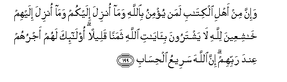 199. Wa-inna min ahli alkitabi laman yu/minu biAllahi wama onzila ilaykum wama onzila ilayhim khashiAAeena lillahi la yashtaroona bi-ayati Allahi thamanan qaleelan ola-ika lahum ajruhum AAinda rabbihim inna Allaha sareeAAu alhisabi