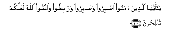 200. Ya ayyuha allatheena amanoo isbiroo wasabiroo warabitoo waittaqoo Allaha laAAallakum tuflihoona
