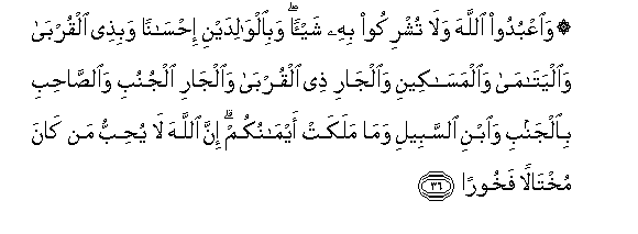 36. WaoAAbudoo Allaha wala tushrikoo bihi shay-an wabialwalidayni ihsanan wabithee alqurba waalyatama waalmasakeeni waaljari thee alqurba waaljari aljunubi waalssahibi bialjanbi waibni alssabeeli wama malakat aymanukum inna Allaha la yuhibbu man kana mukhtalan fakhooran