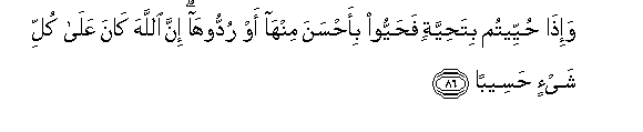 86. Wa-itha huyyeetum bitahiyyatin fahayyoo bi-ahsana minha aw ruddooha inna Allaha kana AAala kulli shay-in haseeban