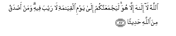 87. Allahu la ilaha illa huwa layajmaAAannakum ila yawmi alqiyamati la rayba feehi waman asdaqu mina Allahi hadeethan