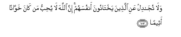 107. Wala tujadil AAani allatheena yakhtanoona anfusahum inna Allaha la yuhibbu man kana khawwanan atheeman
