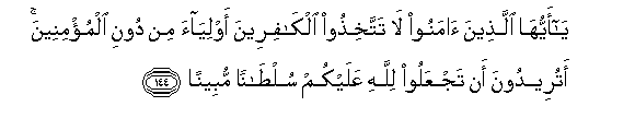 144. Ya ayyuha allatheena amanoo la tattakhithoo alkafireena awliyaa min dooni almu/mineena atureedoona an tajAAaloo lillahi AAalaykum sultanan mubeenan
