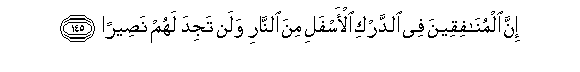 145. Inna almunafiqeena fee alddarki al-asfali mina alnnari walan tajida lahum naseeran