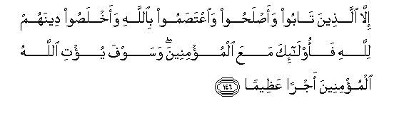 146. Illa allatheena taboo waaslahoo waiAAtasamoo biAllahi waakhlasoo deenahum lillahi faola-ika maAAa almu/mineena wasawfa yu/ti Allahu almu/mineena ajran AAatheeman