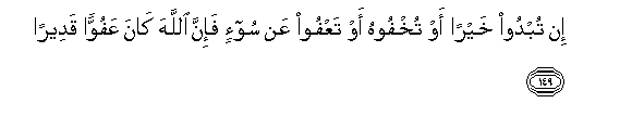 149. In tubdoo khayran aw tukhfoohu aw taAAfoo AAan soo-in fa-inna Allaha kana AAafuwwan qadeeran