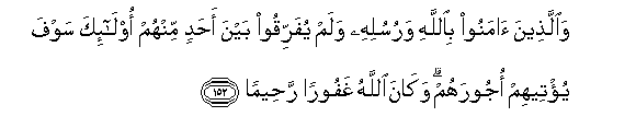 152. Waallatheena amanoo biAllahi warusulihi walam yufarriqoo bayna ahadin minhum ola-ika sawfa yu/teehim ojoorahum wakana Allahu ghafooran raheeman