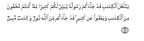 15. Ya ahla alkitabi qad jaakum rasooluna yubayyinu lakum katheeran mimma kuntum tukhfoona mina alkitabi wayaAAfoo AAan katheerin qad jaakum mina Allahi noorun wakitabun mubeenun