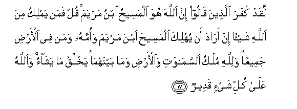 17. Laqad kafara allatheena qaloo inna Allaha huwa almaseehu ibnu maryama qul faman yamliku mina Allahi shay-an in arada an yuhlika almaseeha ibna maryama waommahu waman fee al-ardi jameeAAan walillahi mulku alssamawati waal-ardi wama baynahuma yakhluqu ma yashao waAllahu AAala kulli shay-in qadeerun