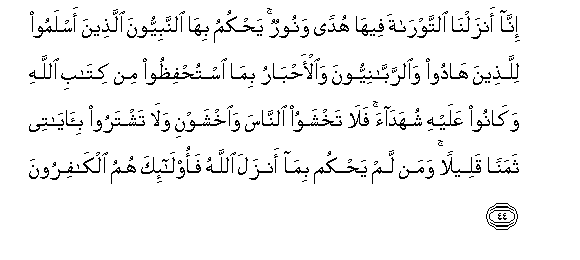 44. Inna anzalna alttawrata feeha hudan wanoorun yahkumu biha alnnabiyyoona allatheena aslamoo lillatheena hadoo waalrrabbaniyyoona waal-ahbaru bima istuhfithoo min kitabi Allahi wakanoo AAalayhi shuhadaa fala takhshawoo alnnasa waikhshawni wala tashtaroo bi-ayatee thamanan qaleelan waman lam yahkum bima anzala Allahu faola-ika humu alkafiroona
