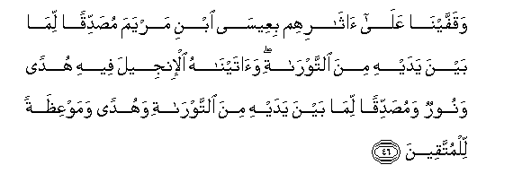 46. Waqaffayna AAala atharihim biAAeesa ibni maryama musaddiqan lima bayna yadayhi mina alttawrati waataynahu al-injeela feehi hudan wanoorun wamusaddiqan lima bayna yadayhi mina alttawrati wahudan wamawAAithatan lilmuttaqeena