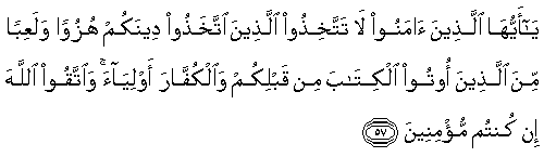 57. Ya ayyuha allatheena amanoo la tattakhithoo allatheena ittakhathoo deenakum huzuwan walaAAiban mina allatheena ootoo alkitaba min qablikum waalkuffara awliyaa waittaqoo Allaha in kuntum mu/mineena