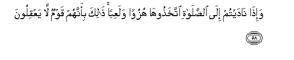 58. Wa-itha nadaytum ila alssalati ittakhathooha huzuwan walaAAiban thalika bi-annahum qawmun la yaAAqiloona