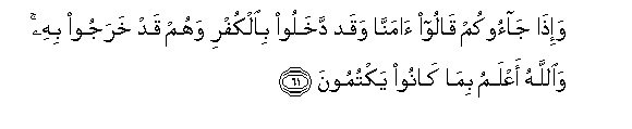 61. Wa-itha jaookum qaloo amanna waqad dakhaloo bialkufri wahum qad kharajoo bihi waAllahu aAAlamu bima kanoo yaktumoona