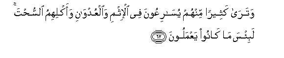 62. Watara katheeran minhum yusariAAoona fee al-ithmi waalAAudwani waaklihimu alssuhta labi/sa ma kanoo yaAAmaloona