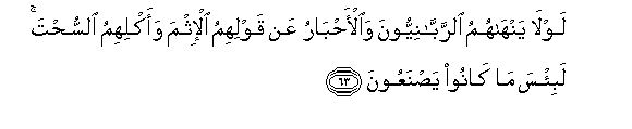 63. Lawla yanhahumu alrrabbaniyyoona waal-ahbaru AAan qawlihimu al-ithma waaklihimu alssuhta labi/sa ma kanoo yasnaAAoona