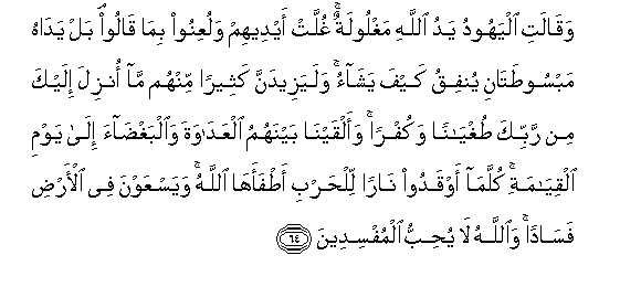 64. Waqalati alyahoodu yadu Allahi maghloolatun ghullat aydeehim waluAAinoo bima qaloo bal yadahu mabsootatani yunfiqu kayfa yashao walayazeedanna katheeran minhum ma onzila ilayka min rabbika tughyanan wakufran waalqayna baynahumu alAAadawata waalbaghdaa ila yawmi alqiyamati kullama awqadoo naran lilharbi atfaaha Allahu wayasAAawna fee al-ardi fasadan waAllahu la yuhibbu almufsideena