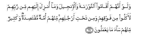 66. Walaw annahum aqamoo alttawrata waal-injeela wama onzila ilayhim min rabbihim laakaloo min fawqihim wamin tahti arjulihim minhum ommatun muqtasidatun wakatheerun minhum saa ma yaAAmaloona