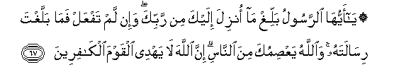 67. Ya ayyuha alrrasoolu balligh ma onzila ilayka min rabbika wa-in lam tafAAal fama ballaghta risalatahu waAllahu yaAAsimuka mina alnnasi inna Allaha la yahdee alqawma alkafireena