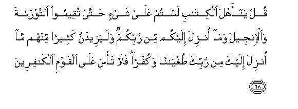 68. Qul ya ahla alkitabi lastum AAala shay-in hatta tuqeemoo alttawrata waal-injeela wama onzila ilaykum min rabbikum walayazeedanna katheeran minhum ma onzila ilayka min rabbika tughyanan wakufran fala ta/sa AAala alqawmi alkafireena