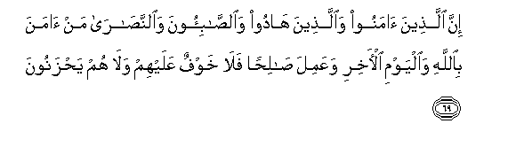 69. Inna allatheena amanoo waallatheena hadoo waalssabi-oona waalnnasara man amana biAllahi waalyawmi al-akhiri waAAamila salihan fala khawfun AAalayhim wala hum yahzanoona