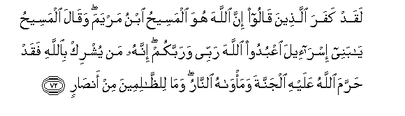 72. Laqad kafara allatheena qaloo inna Allaha huwa almaseehu ibnu maryama waqala almaseehu ya banee isra-eela oAAbudoo Allaha rabbee warabbakum innahu man yushrik biAllahi faqad harrama Allahu AAalayhi aljannata wama/wahu alnnaru wama lilththalimeena min ansarin