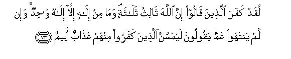 73. Laqad kafara allatheena qaloo inna Allaha thalithu thalathatin wama min ilahin illa ilahun wahidun wa-in lam yantahoo AAamma yaqooloona layamassanna allatheena kafaroo minhum AAathabun aleemun