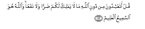 76. Qul ataAAbudoona min dooni Allahi ma la yamliku lakum darran wala nafAAan waAllahu huwa alssameeAAu alAAaleemu