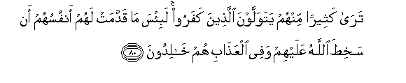 80. Tara katheeran minhum yatawallawna allatheena kafaroo labi/sa ma qaddamat lahum anfusuhum an sakhita Allahu AAalayhim wafee alAAathabi hum khalidoona
