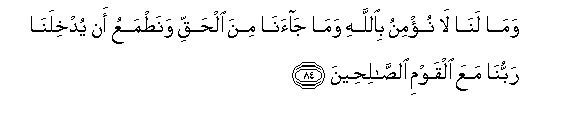 84. Wama lana la nu/minu biAllahi wama jaana mina alhaqqi wanatmaAAu an yudkhilana rabbuna maAAa alqawmi alssaliheena