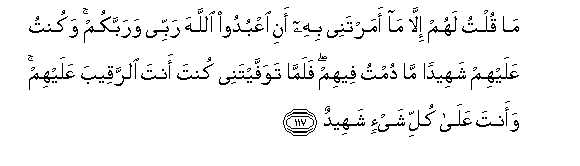 117. Ma qultu lahum illa ma amartanee bihi ani oAAbudoo Allaha rabbee warabbakum wakuntu AAalayhim shaheedan ma dumtu feehim falamma tawaffaytanee kunta anta alrraqeeba AAalayhim waanta AAala kulli shay-in shaheedun