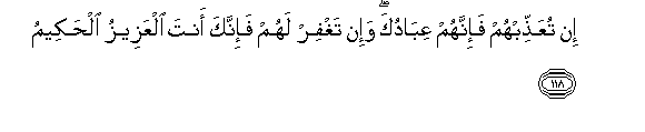 118. In tuAAaththibhum fa-innahum AAibaduka wa-in taghfir lahum fa-innaka anta alAAazeezu alhakeemu