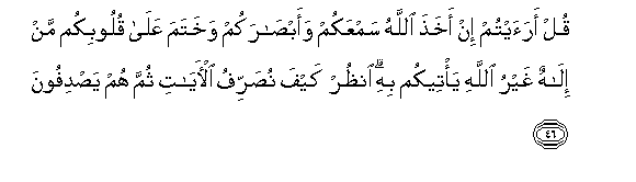 46. Qul araaytum in akhatha Allahu samAAakum waabsarakum wakhatama AAala quloobikum man ilahun ghayru Allahi ya/teekum bihi onthur kayfa nusarrifu al-ayati thumma hum yasdifoona