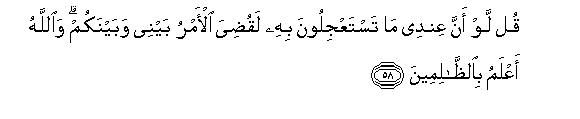 58. Qul law anna AAindee ma tastaAAjiloona bihi laqudiya al-amru baynee wabaynakum waAllahu aAAlamu bialththalimeena