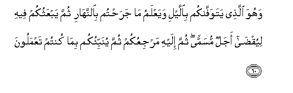 60. Wahuwa allathee yatawaffakum biallayli wayaAAlamu ma jarahtum bialnnahari thumma yabAAathukum feehi liyuqda ajalun musamman thumma ilayhi marjiAAukum thumma yunabbi-okum bima kuntum taAAmaloona