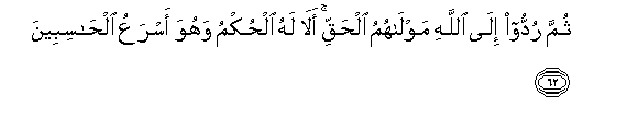 62. Thumma ruddoo ila Allahi mawlahumu alhaqqi ala lahu alhukmu wahuwa asraAAu alhasibeena