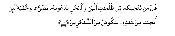 63. Qul man yunajjeekum min thulumati albarri waalbahri tadAAoonahu tadarruAAan wakhufyatan la-in anjana min hathihi lanakoonanna mina alshshakireena