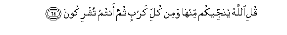 64. Quli Allahu yunajjeekum minha wamin kulli karbin thumma antum tushrikoona