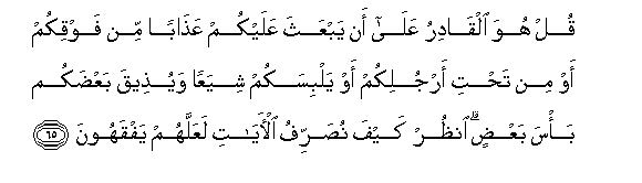 65. Qul huwa alqadiru AAala an yabAAatha AAalaykum AAathaban min fawqikum aw min tahti arjulikum aw yalbisakum shiyaAAan wayutheeqa baAAdakum ba/sa baAAdin onthur kayfa nusarrifu al-ayati laAAallahum yafqahoona