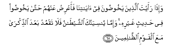 68. Wa-itha raayta allatheena yakhoodoona fee ayatina faaAArid AAanhum hatta yakhoodoo fee hadeethin ghayrihi wa-imma yunsiyannaka alshshaytanu fala taqAAud baAAda alththikra maAAa alqawmi alththalimeena