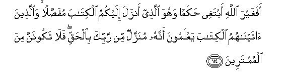 114. Afaghayra Allahi abtaghee hakaman wahuwa allathee anzala ilaykumu alkitaba mufassalan waallatheena ataynahumu alkitaba yaAAlamoona annahu munazzalun min rabbika bialhaqqi fala takoonanna mina almumtareena